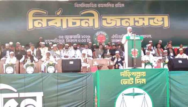 নাজিম হাসান,রাজশাহী জেলা প্রতিনিধি: র্নীতিমুক্ত, শোষণহীন ও ইনসাফভিত্তিক রাষ্ট্র গঠনের লক্ষ্যে আসন্ন নির্বাচন ও গণভোটে জনগণকে ‘হ্যাঁ’এর পক্ষে ঐক্যবদ্ধ হওয়ার আহ্বান জানিয়েছেন বাংলাদেশ জামায়াতে ইসলামীর আমির ডা. শফিকুর রহমান। তিনি বলেন,‘হ্যাঁ মানে আজাদি আর না মানে গোলামী। ন্যায়ভিত্তিক রাষ্ট্র প্রতিষ্ঠায় জনগণের রায়ই হবে চূড়ান্ত শক্তি। বৃহস্পতিবার (৫ ফেব্রুয়ারি) বিকেলে রাজশাহীর ঐতিহাসিক মাদ্রাসা মাঠে ১১ দলীয় নির্বাচনী ঐক্য জোটের নির্বাচনী জনসভায় প্রধান অতিথির বক্তব্যে বাংলাদেশ জামায়াতে ইসলামীর আমির ডা. শফিকুর রহমান এসব কথা বলেন। ডা. শফিকুর রহমান বলেন, জামায়াতে ইসলামী রাষ্ট্র পরিচালনার দায়িত্ব পেলে দেশের প্রতিটি শিশুর শিক্ষার ব্যয়ভার রাষ্ট্র বহন করবে। প্রাথমিক থেকে স্নাতকোত্তর (মাস্টার্স) পর্যন্ত সম্পূর্ণ বিনামূল্যে পড়াশোনার সুযোগ নিশ্চিত করা হবে। তিনি বলেন,১১ দলীয় নির্বাচনী ঐক্যজোটের সকল প্রার্থী দুর্নীতিমুক্ত। তাদের মধ্যে ব্যাংক ডাকাত, চাঁদাবাজ, ঋণখেলাপি কিংবা নারী নির্যাতনকারী কেউ নেই। যোগ্যতা ও সততার ভিত্তিতেই প্রার্থী নির্বাচন করা হয়েছে এবং নিজেরা দুর্নীতি করব না এবং কোনো দুর্নীতিবাজকে প্রশ্রয়ও দেব না। জামায়াত আমির বলেন, অবহেলা ও দুর্নীতির কারণে দেশের পর্যটন খাত আজ ধ্বংসের মুখে। ক্ষমতায় গেলে রাজশাহীর প্রত্নতাত্ত্বিক ও ঐতিহাসিক স্থাপনাগুলোকে বিশ্বমানের পর্যটন কেন্দ্রে রূপান্তর করা হবে, যা জাতীয় অর্থনীতিতে নতুন গতি আনবে এবং হাজার হাজার মানুষের কর্মসংস্থানের সুযোগ সৃষ্টি করবে। আগামী ১২ তারিখের নির্বাচন ও গণভোটকে সামনে রেখে তিনি জনগণকে বিভেদ ভুলে ইনসাফ ও ন্যায়ের পক্ষে দাঁড়ানোর আহ্বান জানান। দুর্নীতিমুক্ত ও শোষণহীন বাংলাদেশ গড়তে ‘হ্যাঁ’ জয়যুক্ত করার মধ্য দিয়েই জনগণের মুক্তি নিশ্চিত হবে বলে তিনি আশাবাদ ব্যক্ত করেন। জনসভা থেকে ডা. শফিকুর রহমান রাজশাহীর ছয়টি সংসদীয় আসনের প্রার্থীদের হাতে দাঁড়িপাল্লা প্রতীক তুলে দেন। জামায়াতে ইসলামী রাজশাহী মহানগরের আমির ড. মো. কেরামত আলীর সভাপতিত্বে জনসভায় বক্তব্য দেন- বাংলাদেশ জামায়াতে ইসলামী নায়েবে আমির অধ্যাপক মো. মুজিবুর রহমান, রাজশাহী-৩ আসনের জামায়াতে ইসলামীর মনোনীত সংসদ সদস্য প্রার্থী অধ্যাপক আবুল কালাম আজাদ, জাতীয় গণতান্ত্রিক পার্টির কেন্দ্রীয় কমিটির সহসভাপতি রাশেদ প্রধান, জাতীয় নাগরিক পার্টির কেন্দ্রীয় কমিটির যুগ্ম সদস্য সচিব ডা. মাহমুদা মিতু, ঢাকসুর জিএস এসএম ফরহাদ, ইসলামী ছাত্রশিবিরের কেন্দ্রীয় সভাপতি নুরুল ইসলাম সাদ্দামসহ জামায়াত-শিবির ও ১১ দলীয় জোটের নেতৃবৃন্দ।