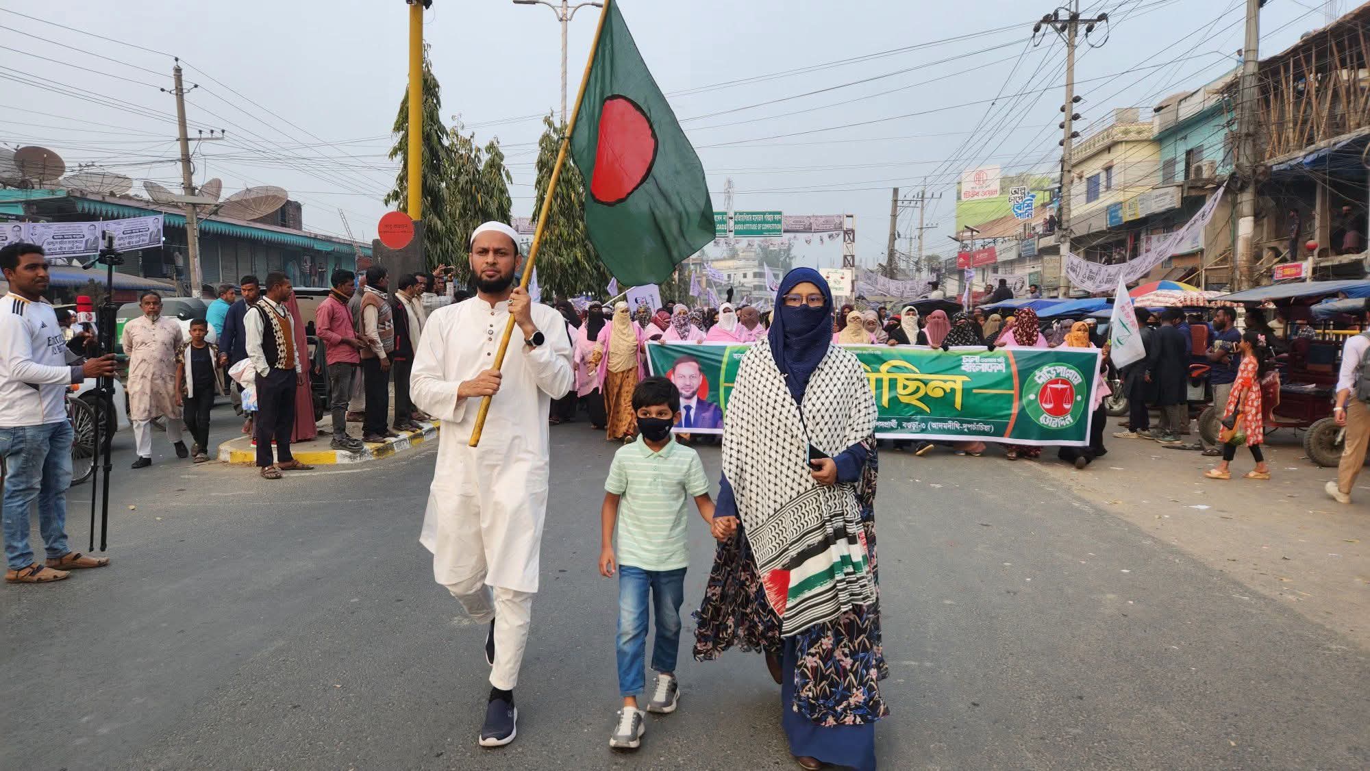 এইসময় গণমিছিলে অংশগ্রহণকারী নারীরা দাড়িপাল্লা প্রতীকের পক্ষে বিভিন্ন স্লোগান দেন।থানা বাসস্টান্ড হতে সি অফিস চত্তর পর্যন্ত গোটা দুপচাঁচিয়া এক ঘন্টা থমকে দাঁড়িয়ে ছিল। কোন যানবাহন চলতে পারেনি জনগনের ভিড়ে।
