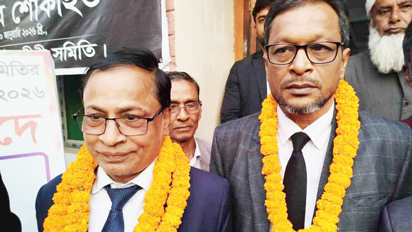 উজ্জ্বল রায়, জেলা প্রতিনিধি নড়াইল থেকে : নড়াইল আইনজীবী সমিতির সভাপতি আজিবুর, সম্পাদক রাজু বায়ে সভাপতি মো. আজিবুর রহমান আজিজ ও ডানে সাধারণ সম্পাদক ইসরাফিল খবির রাজু। নড়াইল জেলা আইনজীবী সমিতির নির্বাচনে সভাপতি ও সাধারণ সম্পাদক পদসহ সংখ্যাগরিষ্ঠ পদে বিএনপি সমর্থিত প্রার্থীদের বিজয় হয়েছে। এতে সভাপতি পদে মো. আজিবুর রহমান আজিজ এবং সাধারণ সম্পাদক পদে ইস্রাফিল খবির রাজু নির্বাচিত হয়েছেন। উজ্জ্বল রায়, জেলা প্রতিনিধি নড়াইল থেকে জানান, সোমবার (১৬ ফেব্রুয়ারি) সকাল ১০টা থেকে জেলা আইনজীবী সমিতির এক নম্বর ভবনে ভোটগ্রহণ শুরু হয়ে চলে বিকেল সাড়ে ৩টা পর্যন্ত। সন্ধ্যায় ভোট গণনা শেষে ফলাফল ঘোষণা করেন নির্বাচন পরিচালনা কমিটির চেয়ারম্যান অ্যাডভোকেট শেখ নুর মোহাম্মদ।