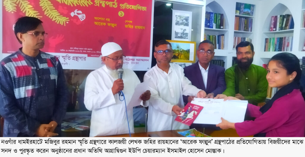 নওগাঁর ধামইরহাটে কালজয়ী লেখক জহির রায়হানের ‘আরেক ফাল্গুন’ গ্রন্থপাঠ প্রতিযোগিতা অনুষ্ঠিত হয়েছে। ২১ ফেব্রুয়ারী বেলা ১১ টায় আগ্রাদ্বিগুন বাজারে অবস্থিত মজিবুর রহমান স্মৃতি গ্রন্থগারে এস.এম খেলাল ই রব্বানীর সভাপতিত্বে ‘আরেক ফাল্গুন’ গ্রন্থের পাঠ প্রতিযোগিতায় অংশ নেন বিভিন্ন স্কুল কলেজের ৩০ জন শিক্ষার্থী। ভাষা আন্দোলনে কারাবরণকারী জহির রায়হানের অবদান, তার জীবন ইতিহাস ও বাংলা ভাষা নিয়ে আবৃতি ও গ্রন্থপাঠে বিজয়ীদের সনদ ও পুরস্কৃত করেন অনুষ্ঠানের প্রধান অতিথি আগ্রাদ্বিগুন ইউপি চেয়ারম্যান ইসমাইল হোসেন মোস্তাক। বাংলাদেশ পরিবেশ আন্দোলন বাপা’র সাধারণ সম্পাদক আলোকিত মানবিক মানুষ গড়ার কারিগর মো. আলমগীর কবিরের নিজ হাতে গড়া মজিবুর রহমান স্মৃতি গ্রন্থগারের আয়োজনে ও সম্মিলিত পাঠাগার আন্দোলন টাঙ্গাইলের সহযোগিতায় গ্রন্থপাঠ অনুষ্ঠানে বক্তব্য রাখেন আগ্রাদ্বিগুন কলেজের অধ্যক্ষ মো. মোজাফফর রহমান, সম্মিলিত পাঠাগার আন্দোলনের সাংগঠনিক সম্পাদক রহমান রায়হান, উপজেলা প্রেস ক্লাবের সভাপতি এম এ মালেক, উপস্থাপক রায়হান পারভেজ প্রমুখ। গ্রন্থপাঠে আগ্রাদ্বিগুন বালিকা উচ্চ বিদ্যালয়ের শিক্ষার্থী আতকিয়া আনজুম আদ্রিতা, ২য় তাসনিম জান্নাত, ৩য় জুয়াইরিয়া জুথি, ৪র্থ রাফিয়া জান্নাত ও ৫ম সোহানা সাথী নির্বাচিত হয়েছেন। পরবর্তীদের তাদের বিভাগীয় পর্যায়ে অংশ গ্রহণের সুযোগ প্রদান করা হবে বলে আয়োজনবৃন্দ জানান।