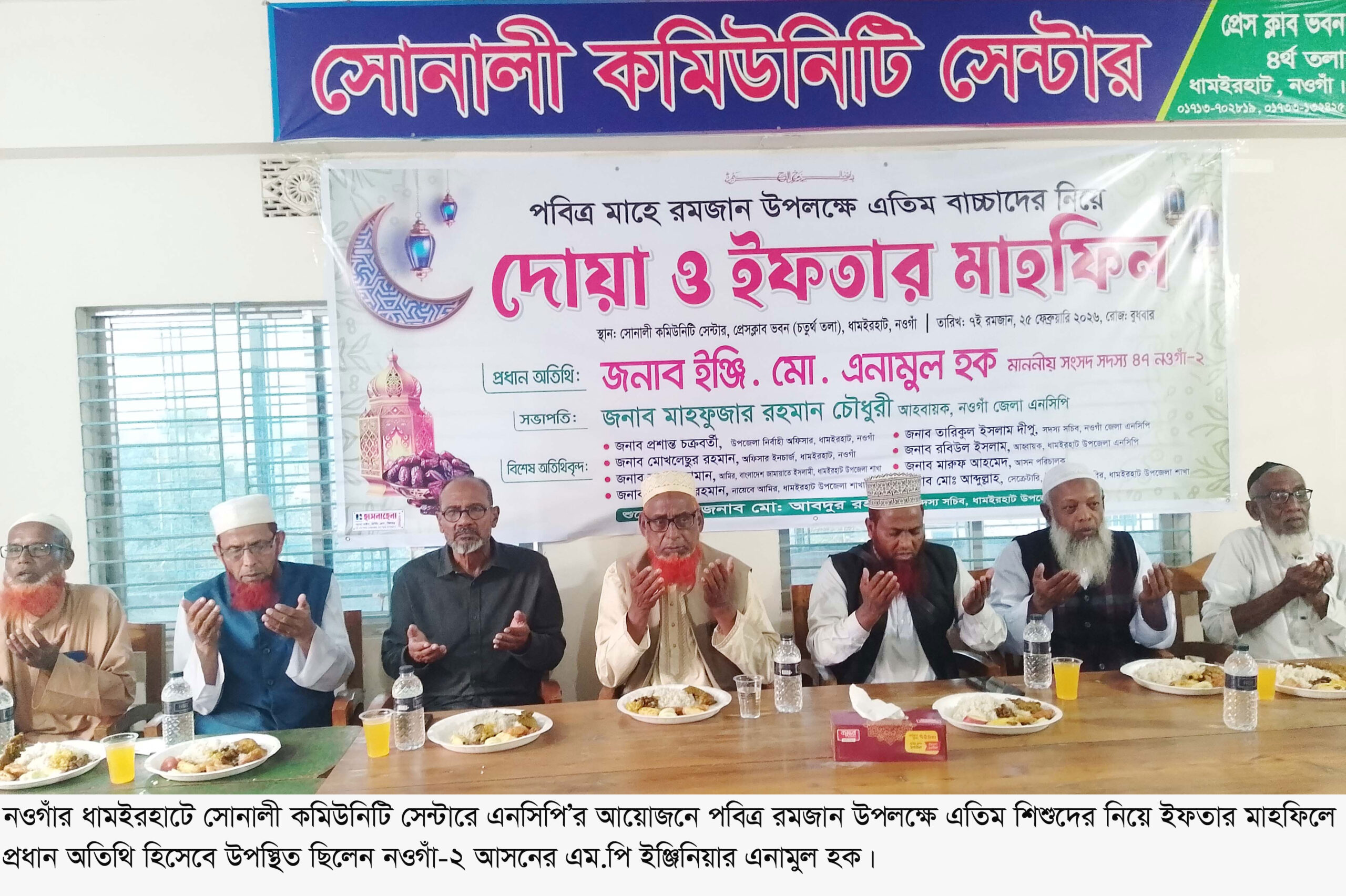 নওগাঁর ধামইরহাটে অসহায়-এতিম শিশুদের নিয়ে ইফতার মাহফিলের আয়োজন করেছে এনসিপি তথা ন্যাশনাল সিটিজেন পার্টি। ২৫ ফেব্রুয়ারী বিকেলে ধামইরহাট ভবনের সোনালী কমিউনিটি সেন্টারে নওগাঁ জেলা এনসিপির আহবায়ক মাহফুজার রহমান চৌধুরী রুবেলের সভাপতিত্বে অনুষ্ঠানে প্রধান অতিথি হিসেবে উপস্থিত ছিলেন নওগাঁ-২ আসনের এম.পি ইঞ্জিনিয়ার মো. এনামুল হক। ইফতার মাহফিলে দোয়া পরিচালনা করেন উপজেলা জামায়াতের আমির মাওলানা মো. কামরুজ্জামান।
