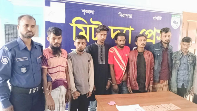 ঘোড়াঘাট, প্রতিনিধিঃ- দিনাজপুরের হাকিমপুর হিলিতে পুলিশের মাদক বিরুদ্ধি অভিযানে মাদকদ্রব্য ২৫ পিচ ইয়াবা ও ২৬০ পিচ ট্যাপেন্টাডল ট্যাবলেট সহ ৮ জন মাদকসেবী ও ব্যবসায়ীকে গ্রেফতার করেছে থানা পুলিশ। শুক্রবার (২৭ফেব্রুয়ারী) মধ্যে রাতে পুলিশ অভিযান চালিয়ে উপজেলার খট্রামাধবপাড়া ইউনিয়নের মাধবপাড়া গ্রামের আলুহাটির মোড় এলাকার জনৈক তুফানুর বাড়ি থেকে মাদক সহ তাদের হাতে নাতে গ্রেফতার করে। গ্রেফতারকৃত আসামীরা হলেন, মাধবপাড়া আলুহাটি মোড় এলাকার তুফানুর ছেলে পলাশ হোসেন (৩৮), ইস্রাফিল হোসনের ছেলে মোঃ জুয়েল হোসেন (৩৭), খোদাবক্সের ছেলে লাল চাঁন আলী (২৭), শাহাজ উদ্দিনের ছেলে পিয়ারুল ইসলাম (২৭), বাঁশি মিয়ার ছেলে আজাদুল ইসলাম (৩৮), রহিদুল ইসলামের ছেলে মারুফ হোসেন (১৯), পার্শ্ববর্তী বিরামপুর থানার উত্তর কাটলা গ্রামের কপিল উদ্দিনের ছেলে শাহিন বাবু (৩২), এবং বিরামপুর উপজেলার চন্ডিপুর গ্রামের কামিনুর ইসলামের ছেলে নুর জামান (৩৬)। বিষয়টি নিশ্চিত করে হাকিমপুর থানার ভারপ্রাপ্ত কর্মকর্তা ওসি মোঃ জাকির হোসেন বলেন, হাকিমপুর হিলি সীমান্তবর্তী থানা। এই থানা এলাকায় শতভাগ মাদকমুক্ত ও আইনশৃঙ্খলা পরিস্থিতি স্বাভাবিক রাখতে পুলিশের অভিযান অব্যাহত রয়েছে। তারই অংশ হিসেবে শুক্রবার রাতে গোপন সংবাদের ভিত্তিতে এসআই মোঃ মোস্তাফিজুর রহমান ও সঙ্গীয় ফোর্স সহ পুলিশের একটি চৌকস দল ঘটনা স্থলে অভিযান চালিয়ে মাদকদ্রব্য ২৫ পিচ ইয়াবা ও ট্যাপেন্টাডল ট্যাবলেট সহ তাদের হাতেনাতে গ্রেফতার করা হয়েছে। হাকিমপুর থানা মামলা নং ৬। পুলিশের মাদক বিরোধী অভিযান ভবিষ্যতে অব্যাহত থাকবে বলে জানান তিনি।