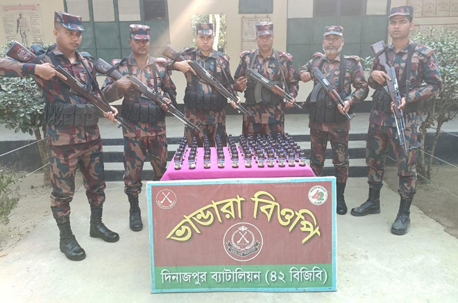 দিনাজপুর ব্যাটালিয়ন ৪২ বিজিবি এর বিশেষ অভিযানে বিরল সীমান্তে ৭৬ বেতল ভারতীয় ফেন্সিডিল উদ্ধার