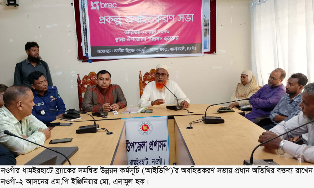 নওগাঁর ধামইরহাটে ব্র্যাকের সমন্বিত উন্নয়ন কর্মসূচি (আইডিপি)’র অবহিতকরণ সভা অনুষ্ঠিত হয়েছে। ২ মার্চ বেলা ১১ টায় উপজেলা পরিষদ সভাকক্ষে ইউএনও প্রশান্ত চক্রবর্তীর সভাপতিত্বে আইডিপির বরেন্দ্র প্রকল্পের অবহিতকরণ সভায় প্রধান অতিথি হিসেবে উপস্থিত ছিলেন নওগাঁ-২ আসনের এম.পি ইঞ্জিনিয়ার মো. এনামুল হক। সভায় আইডিপি’র ঝড়ে পড়া শিক্ষার্থী, ওয়াশ, স্বাস্থ্য, আয়বর্ধনমুলক আল্ট্রাপুওর গ্রাজুয়েশন, জেন্ডার সমতা ও নারীর ক্ষমতায়ন, কৃষি ও খাদ্য নিরাপত্তা এবং দক্ষতা উন্নয়ন বিষয়ে বিস্তারিত আলোকপাক করেন প্রকল্পের আঞ্চলিক ব্যবস্থাপক জোনাস সরেন।