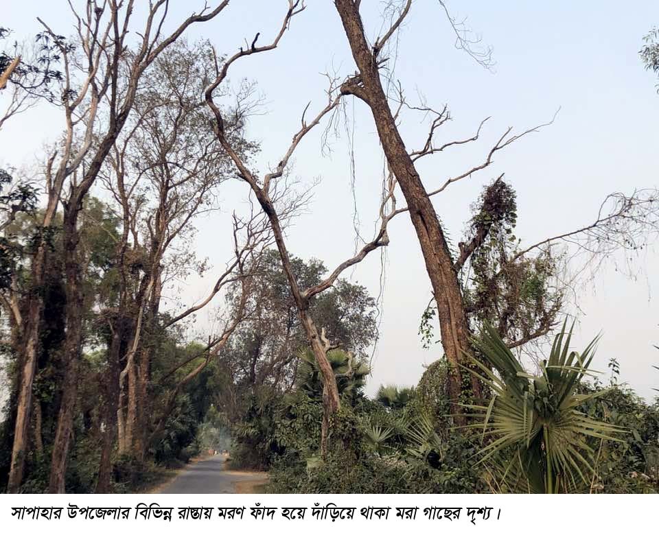 সাপাহার উপজেলার বিভিন্ন সড়কে সারি সারি দাঁড়িয়ে থাকা মরা গাছগুলি এখন পথচারীসহ এলাকার মানুষের জন্য মরণফাঁদে পরিণত হয়ে দাঁড়িয়েছে আছে । দেশে সংশ্লিষ্ট কর্তৃপক্ষ থাকলেও যেন দেখার কেউ নেই রাস্তায় দাঁড়িয়ে থাকা এসব গাছে যে কোনো সময় বড় ধরনের দুর্ঘটনা ঘটাতে পারে, এমন আতঙ্ক ও আশঙ্কা নিয়ে চলাচল করছে ওই এলাকার পথচারী সহ সকল ধরণের যানবাহন। প্রতিনিয়ত ছোটো-খাটো দুর্ঘটনাও ঘটে চলেছে।
