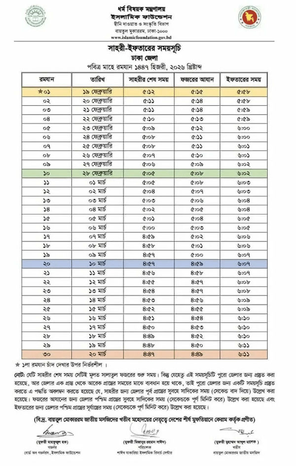 সময়সূচি অনুযায়ী, ১৯ ফেব্রুয়ারি প্রথম রমজানে ঢাকায় সেহরির শেষ সময় ভোররাত ৫টা ১২ মিনিট ও ইফতারির সময় ৫টা ৫৮ মিনিট।